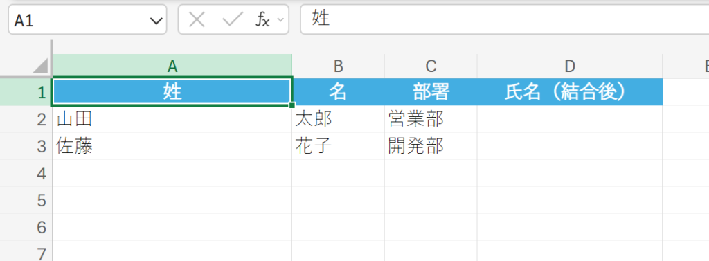 「姓」と「名」の間に半角スペースを入れて結合する例を見てみましょう。