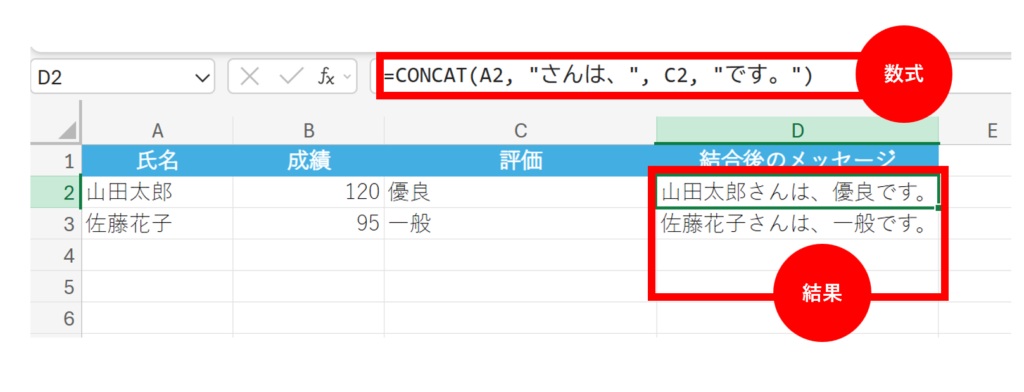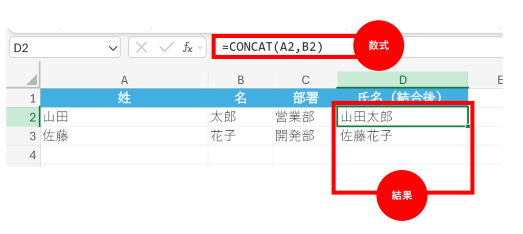 セル D2 に =CONCAT(A2,B2) と入力すると、A2(山田)と B2(太郎)が結合されて「山田太郎」と表示されます。