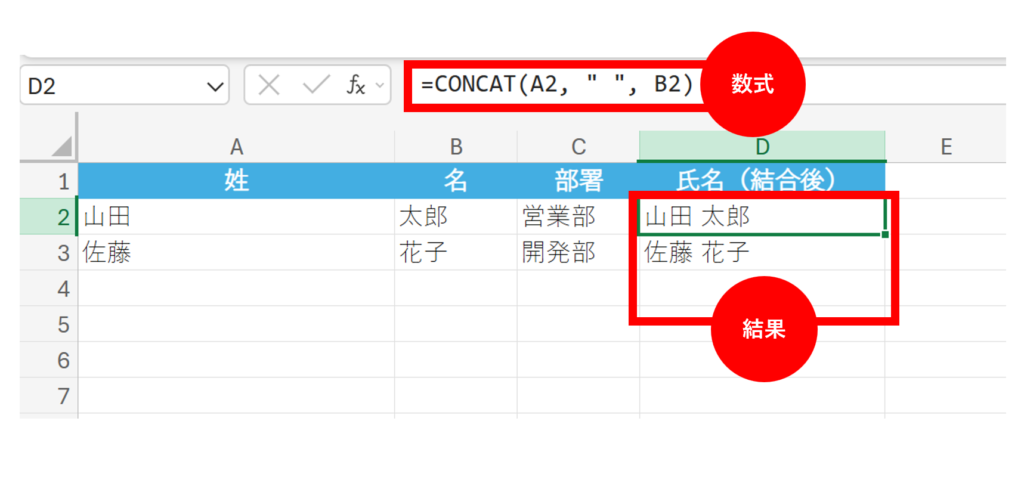 セル D2 に =CONCAT(A2, ” “, B2) と入力すると、「山田 太郎」と表示されます。