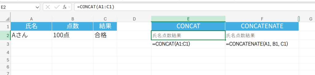 - CONCAT関数:=CONCAT(A1:C1) のように、セルA1からC1までの範囲を一気に指定できます。