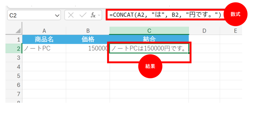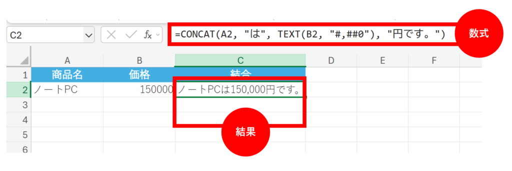 =CONCAT(A2, “は”, TEXT(B2, “#,##0”), “円です。”)