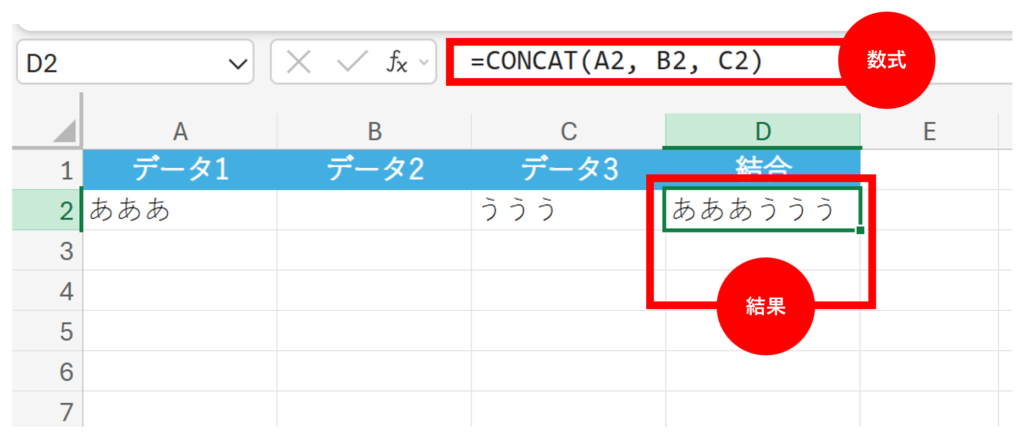 データ1とデータ3の間に、空白のデータ2が入っていても、結合後の文字列には影響がないのが特徴です。