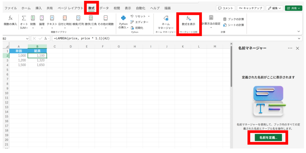 セルに直接書くのもいいですが、LAMBDA関数の便利な点は「名前を付けて保存できること」にあります。一度登録すれば、SUMやAVERAGEのように、いつでも呼び出せるようになります。