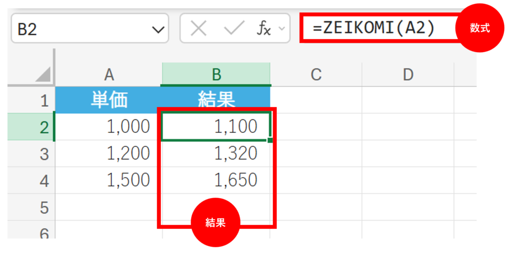 これで準備完了です!次からは以下のようにセルに =ZEIKOMI(A2) と打つだけで計算できるようになります。