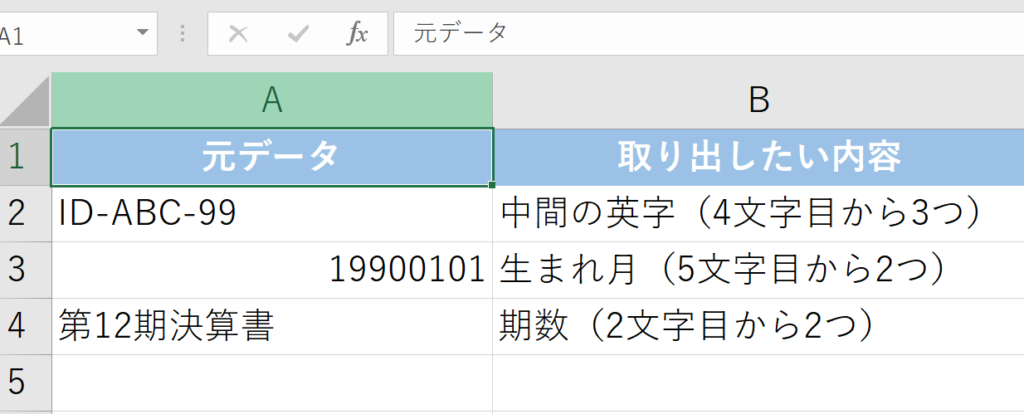 まずは、抜き出したい位置と文字数が決まっている場合の例です。