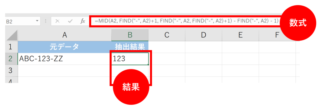 実務で一番多いのが、「( )の中身だけ抜きたい」「ハイフンとハイフンの間を抜きたい」というケースです。文字数がバラバラな場合は、FIND関数で位置を計算します。