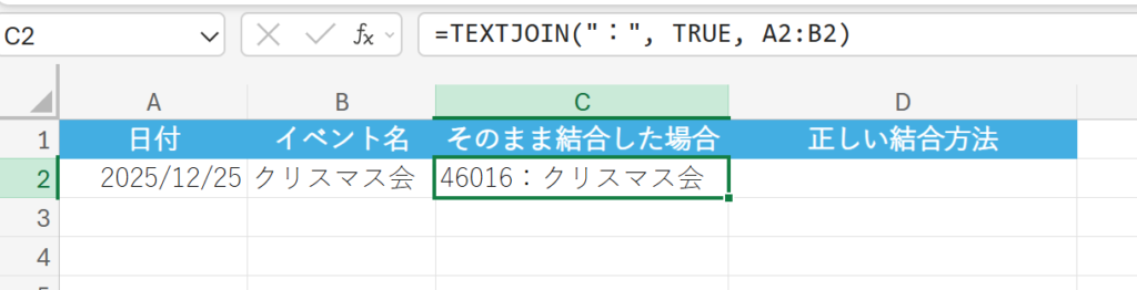 TEXTJOIN関数で日付を結合しようとすると、日付が「45412」のような謎の数字(シリアル値)になってしまうことがあります。
