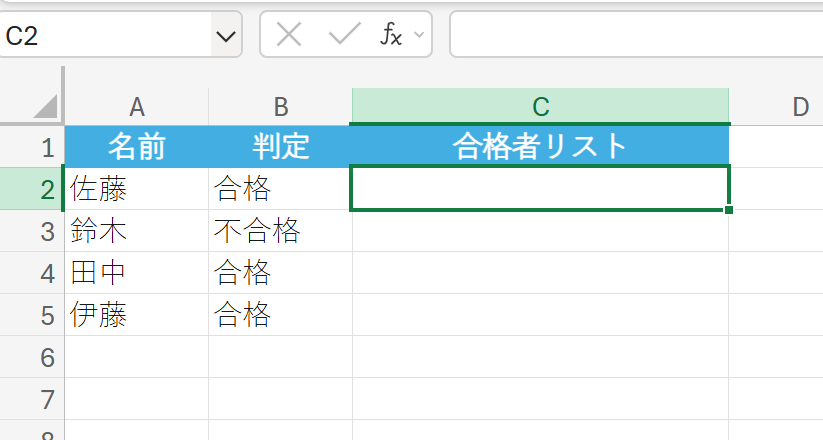 「もしB列が合格ならA列の名前を、そうでなければ空文字を」という命令をIF関数で行い、その結果をTEXTJOINでガッチャンコするイメージです。