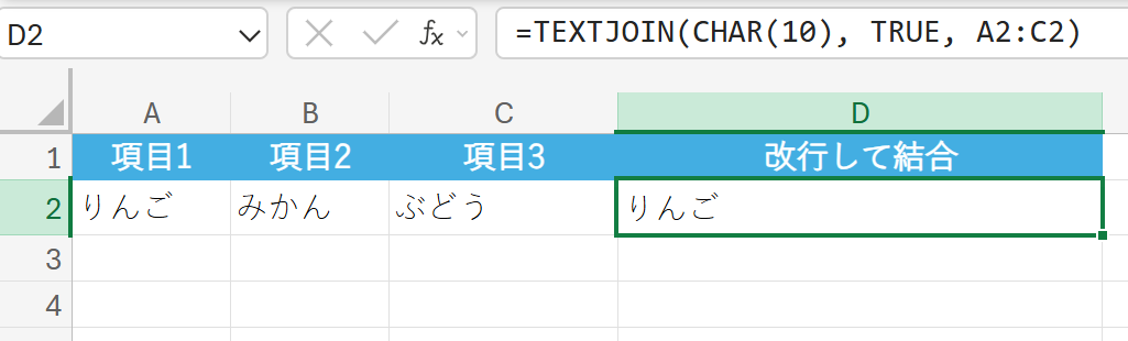 TEXTJOINの最大のメリットは、空白セルがあった際に見栄えを自動で整えてくれる点です。