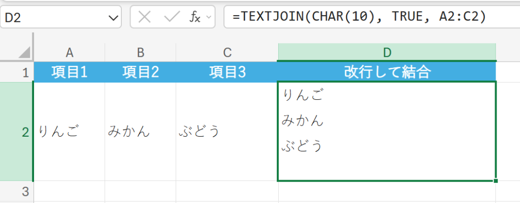 データの区切りをカンマではなく「セル内改行」にしたいこともありますよね。その場合は、区切り文字にCHAR(10)を使用します。