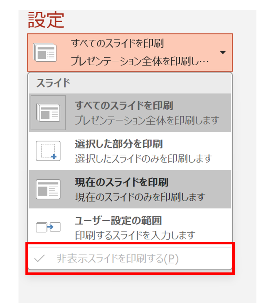 ファイル」>「印刷」の設定項目にある「すべてのスライドを印刷」のプルダウンをクリックし、一番下にある「非表示スライドを印刷する」にチェックを入れます。