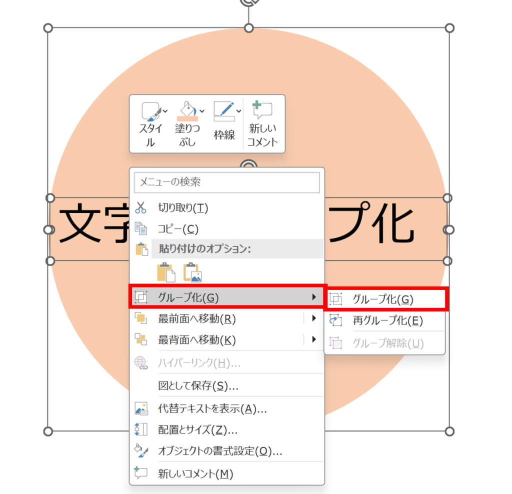 最も効率的なのはキーボード操作です。図形と文字を使って「グループ化」をしてみましょう。