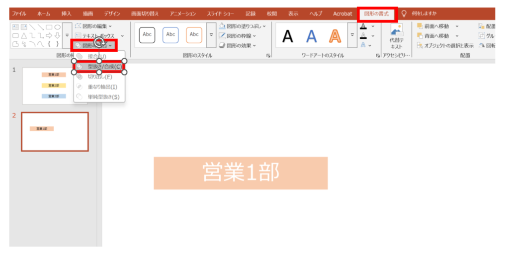 3. 「図形の書式」タブ > 「図形の結合」 > 「型抜き/合成」などを選びます。