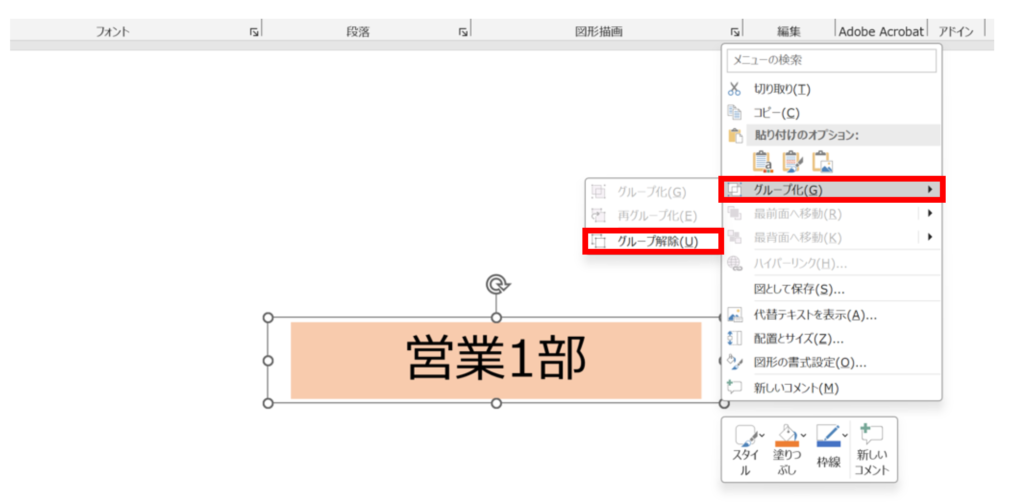 3. または、右クリック > 「グループ化」 > 「グループ解除」を選択。