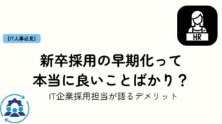 就職活動 【人事のホンネ】新卒採用の早期化って本当に良いことばかり?IT企業採用担当が語るデメリット 皆さん、こんにちは!私はIT企業で新卒・中途の採用を担当しています!27卒・28卒・29卒向けにインターンシップやオープンカンパニー、早期選考などがますます進んでいますよね。「優秀な学生をいち早く確保できる」「選考期間を... 2025.05.18 就職活動