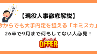 就職活動 【現役人事徹底解説】26卒で9月まで何もしてない人必見!今からでも大手内定を狙える「キミスカ」 26卒で9月になっても内定がないと焦っていませんか?「もう手遅れかも...」と不安なあなたへ。今からでも間に合う就活サービス「キミスカ」のメリット・デメリットを現役人事が徹底解説。効率的な内定獲得の秘訣を教えます! 2025.09.27 就職活動