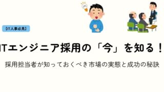 人事 ITエンジニア採用の「今」を知る!採用担当者が知っておくべき市場の実態と成功の秘訣 「ITエンジニア採用が難しい」と感じるあなたへ。最新データから読み解くIT人材市場の現状と、採用を成功させるための秘訣を徹底解説。採用担当者が知るべき給与相場、リモートワーク、副業など、選ばれる企業になるための戦略を優しい先輩目線でご紹介します。 2025.07.07 人事
